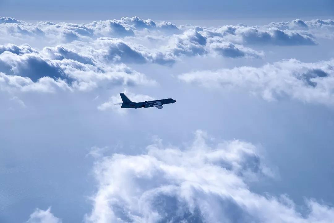 画面中,轰6K在蓝天白云间稳定飞行,机身上中国空军的机徽标志清晰可见。