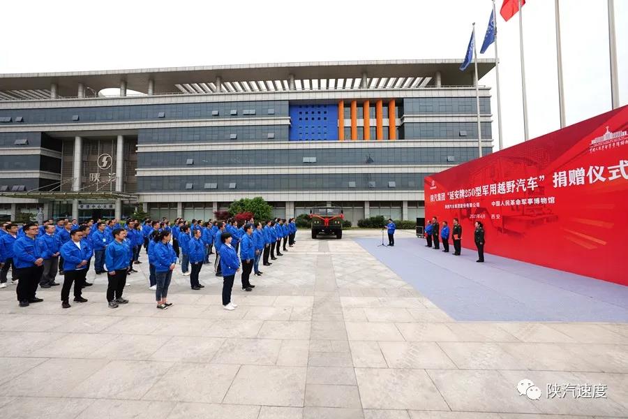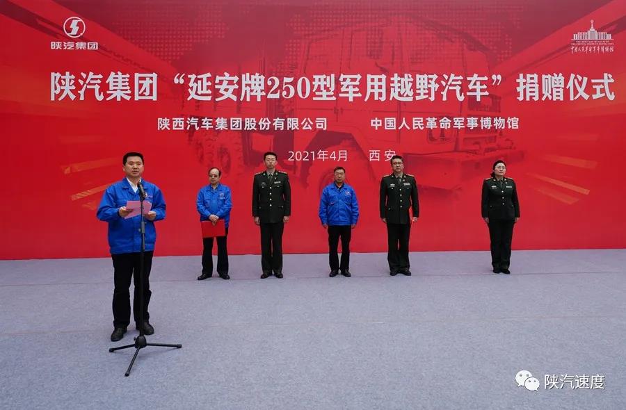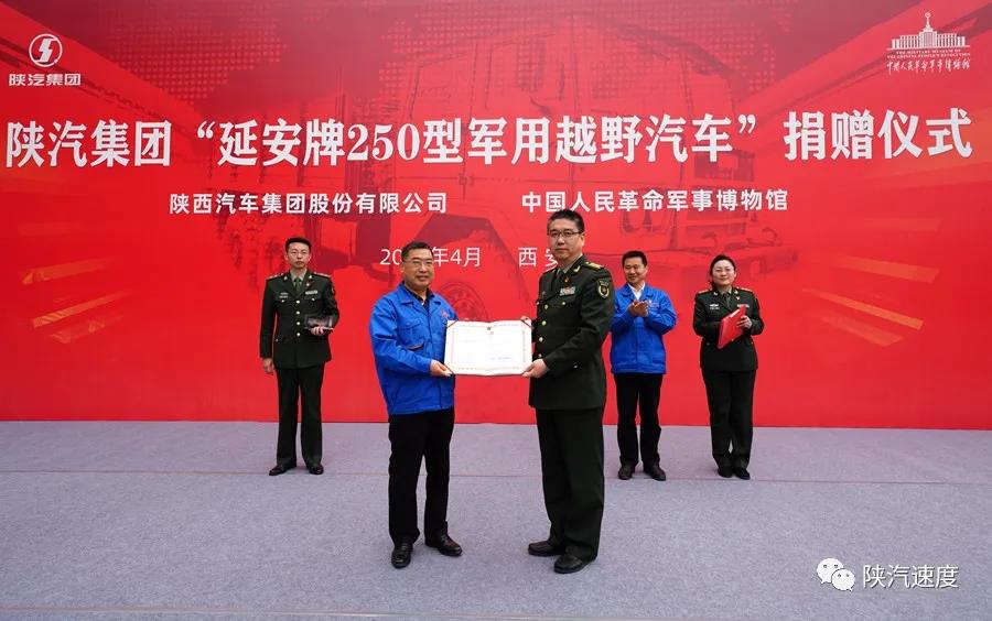 4月27日,我国第一代军车延安牌250型军用越野汽车捐赠仪式在陕汽西安商用车产业园举行,雄浑的军乐声中,陕汽控股党委书记、董事长袁宏明将象征延安牌250型军用越野汽车的水晶摆件赠与中国人民革命军事博物馆副馆长李虎林,并从李虎林手中接过收藏证书。李虎林与陕汽控股党委副书记、总经理周相强分别致辞,陕重汽副总经理郝树奇主持仪式。