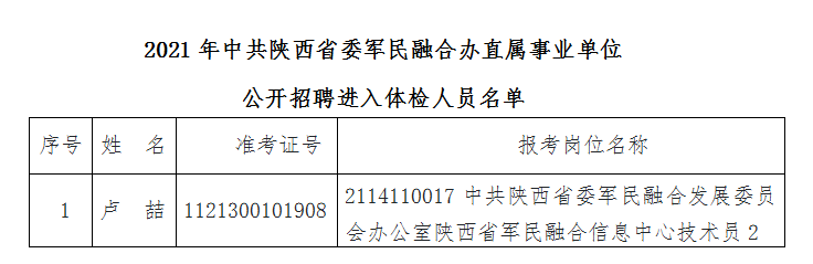 报考中共陕西省委军民融合发展委员会办公室事业单位公开招聘职位并进入体检人员。具体名单详见附件。