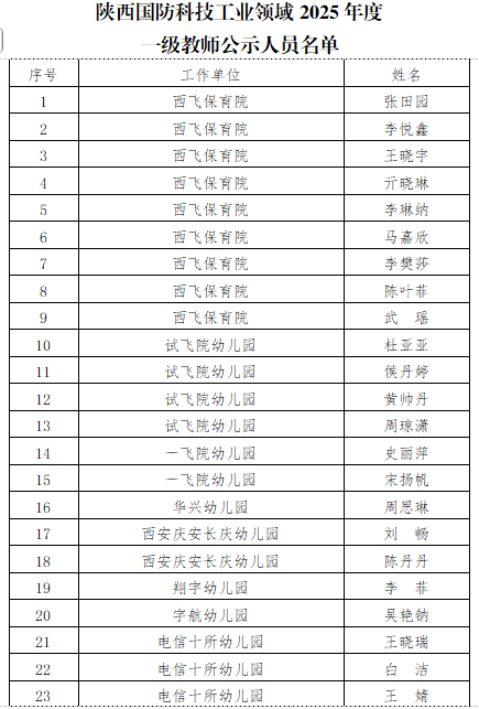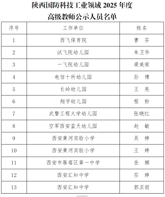 经2025年度中小学教师系列高级职称评审委员会评审,曹芬等13名同志具备高级教师资格,张田园等49名同志具备一级教师资格(名单附后),根据《关于开展2025年度陕西国防科技工业领域中小学教师系列职称评审工作的通知》(陕人社函〔2025〕308号)文件要求,现予以公示。